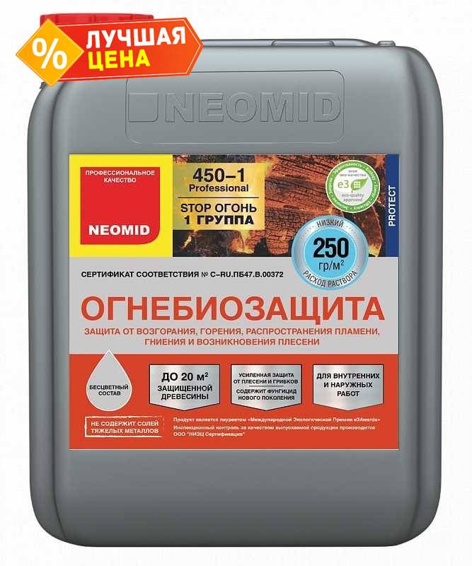 Неомид 450-1 – высокоэффективное средство для огнезащиты и антисептирования древесины для наружных и внутренних работ в условиях, исключающих вымывание состава с обработанной поверхности. Переводит древесину в трудновоспламеняемый и трудногорючий материал, обеспечивая I (первую) группу огнезащитной эффективности по ГОСТ Р 53292-2009, защищает от гниения, возникновения плесени.